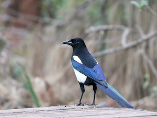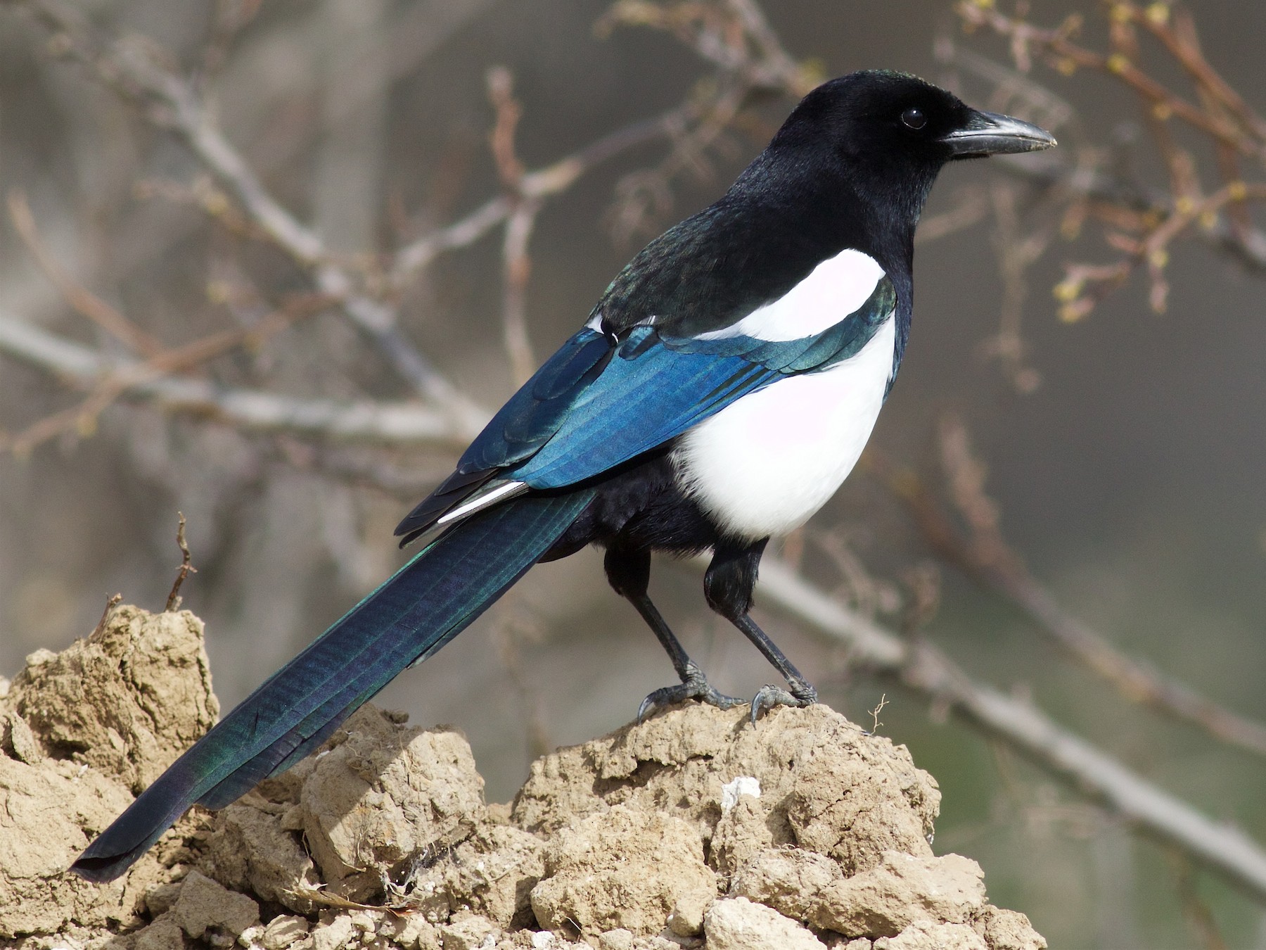 Magpie Bird - Black Billed Magpie Ebird / Black head, body and wings, with a sharply defined white belly and a long black tail, the tail and wings tinged with iridescent greens, blues and purples when seen at close quarters.